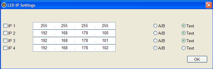 Für die getrennte Ansteuerung müssen die entsprechenden IPs aktiviert und der Broadcast deaktviert werden. Bitte nicht den Broadcast gemeinsam mit anderen IPs verwenden, der Controller auf den Displays ist nicht so schnell das er beide Informationen innerhalb der kurzen Zeit verarbeiten kann.