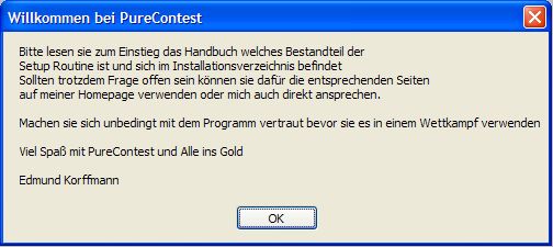 Bitte installieren sie das Programm in dem Verzeichnis ihrer Wahl. Beutzen sie bitte nicht die Standard Programmverzeichnisse von Windows. Da PureContest, mit Ausnahme der Deinstallationsroutine, keine Einträge in die Registry schreibt kann es auch auf einem Wechseldatenträger installiert werden. Beachten sie beim ersten Start auf die Meldungen der Windows Firewall und lassen sie den Zugriff auf das lokale Netzwerk zu. Ein Ablehnen führt zu unerwünschte Ergebnissen im Programmablauf und muss nachträglich in den Einstellungen korrigiert werden. Eventuelle Fehlermeldungen der LEDDisplay.exe unbedingt mit „Weiter“ bestätigen. Diese Meldungen sollten nur beim ersten Start der Anwendung erscheinen. PureContest ist auf allen aktuellen Windows Versionen lauffähig. Bei Home Versionen muss mit Einschränkungen bei der Netzwerkfähikeit gerechnet Werden.